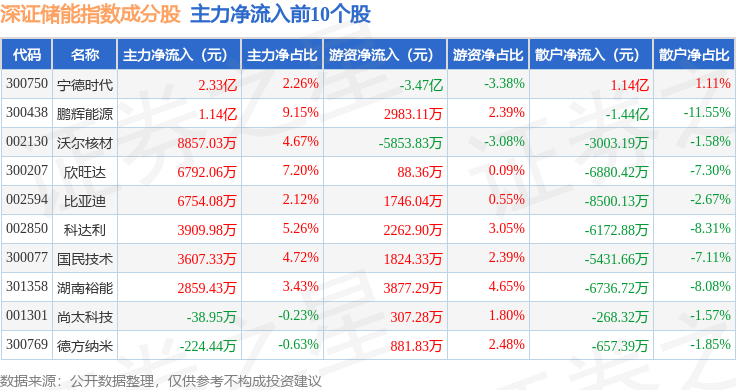 资金流向方面,深证储能(970036)指数成份股当日主力资金净流出合计51.2亿元,游资资金净流入合计12.73亿元,散户资金净流入合计38.46亿元。成份股资金流向详情见下表: