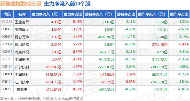 资金流向方面,新基建(980029)指数成份股当日主力资金净流出合计49.08亿元,游资资金净流入合计9.42亿元,散户资金净流入合计39.66亿元。成份股资金流向详情见下表: