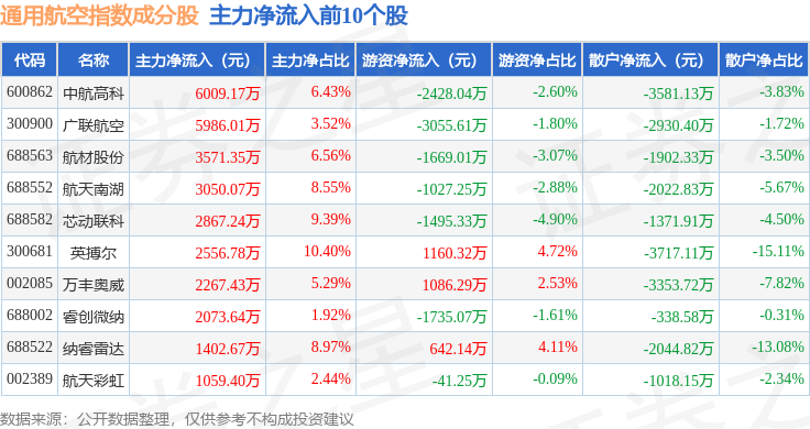 资金流向方面,通用航空(980076)指数成份股当日主力资金净流出合计14.8亿元,游资资金净流入合计6.99亿元,散户资金净流入合计7.81亿元。成份股资金流向详情见下表: