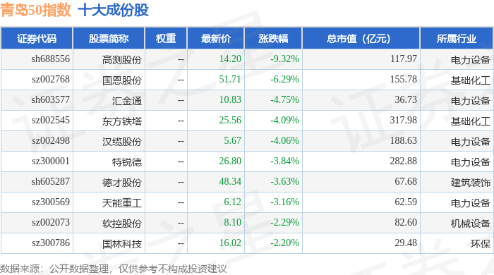 青岛50(989011)指数十大成份股详情如下: