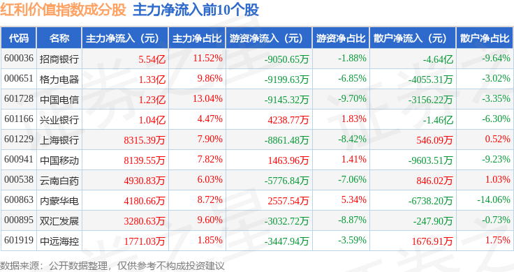 资金流向方面,红利价值(989016)指数成份股当日主力资金净流入合计5.53亿元,游资资金净流出合计3.94亿元,散户资金净流出合计1.59亿元。成份股资金流向详情见下表: