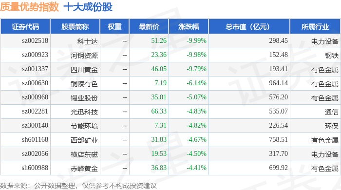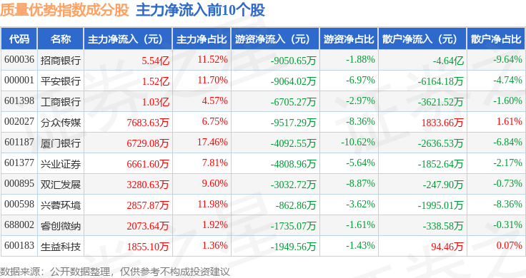资金流向方面,质量优势(989017)指数成份股当日主力资金净流出合计34.26亿元,游资资金净流入合计4.95亿元,散户资金净流入合计29.31亿元。成份股资金流向详情见下表: