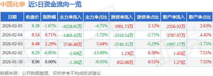 证券之星消息,截至2026年2月5日收盘,中国化学(601117)报收于8.38元,下跌1.87%,换手率1.75%,成交量106.29万手,成交额8.96亿元。