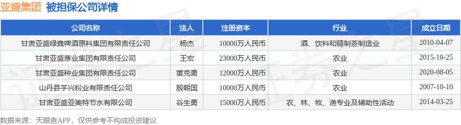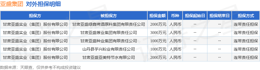 亚盛集团2月4日披露5笔对外担保,被担保公司5家。对外担保明细如下表: