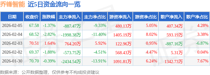 证券之星消息,截至2026年2月5日收盘,乔锋智能(301603)报收于67.58元,下跌1.37%,换手率3.72%,成交量1.4万手,成交额9506.94万元。