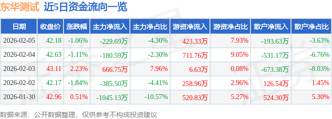 证券之星消息,截至2026年2月5日收盘,东华测试(300354)报收于42.18元,下跌1.06%,换手率1.55%,成交量1.26万手,成交额5337.2万元。