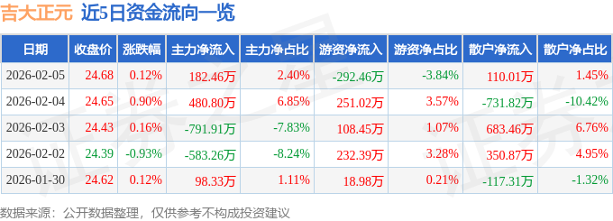 2月5日的资金流向数据方面,主力资金净流入182.46万元,占总成交额2.4%,游资资金净流出292.46万元,占总成交额3.84%,散户资金净流入110.01万元,占总成交额1.45%。