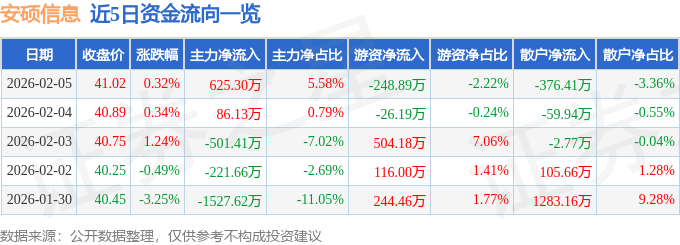 证券之星消息,截至2026年2月5日收盘,安硕信息(300380)报收于41.02元,上涨0.32%,换手率2.14%,成交量2.73万手,成交额1.12亿元。