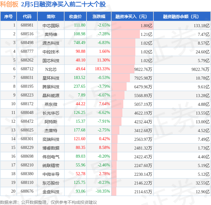 科创板融资净买入前三分别为:中芯国际(688981)融资净买入1.8亿元、奥特维(688516)融资净买入1.21亿元、源杰科技(688498)融资净买入1.02亿元,前20具体见下表: