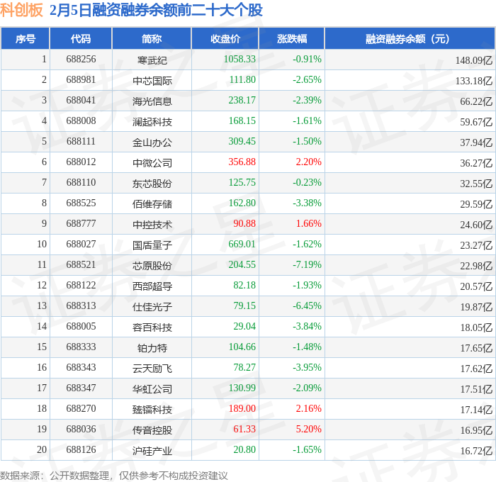 科创板融资融券余额前三分别为:寒武纪(688256)融资融券余额148.09亿元、中芯国际(688981)融资融券余额133.18亿元、海光信息(688041)融资融券余额66.22亿元,前20具体见下表: