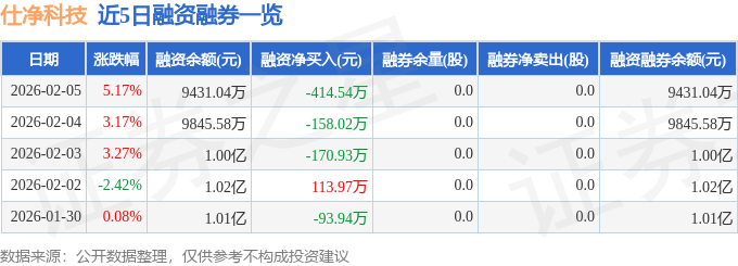 仕净科技融资融券信息显示,融资方面,当日融资买入1394.48万元,融资偿还1809.02万元,融资净偿还414.54万元。融券方面,融券卖出0.0股,融券偿还0.0股,融券余量0.0股,融券余额0.0万元。融资融券余额9431.04万元。