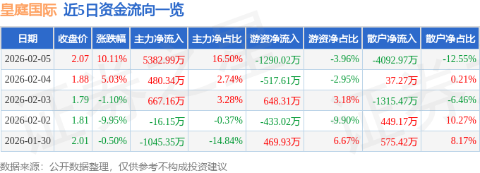 证券之星2月6日盘中消息,9点32分皇庭国际(000056)触及涨停板。其所属行业房地产服务目前上涨。领涨股为皇庭国际。该股为住房租赁,物业管理,深圳本地股概念热股。