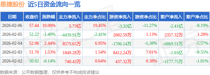 2月6日的资金流向数据方面,主力资金净流入5.73亿元,占总成交额19.45%,游资资金净流出3.32亿元,占总成交额11.27%,散户资金净流出2.41亿元,占总成交额8.19%。