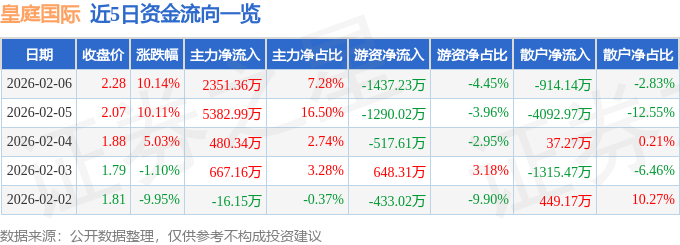 证券之星消息,皇庭国际2月6日涨停收盘,收盘价2.28元。该股于9点32分涨停,2次打开涨停,截止收盘封单资金为3519.3万元,占其流通市值1.71%。