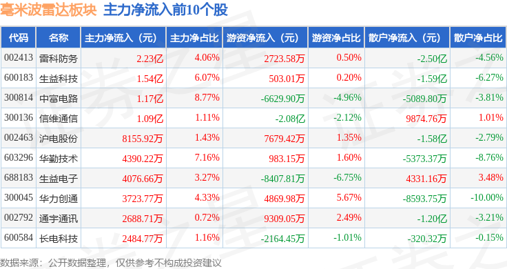 从资金流向上来看,当日毫米波雷达板块主力资金净流出7.32亿元,游资资金净流入7129.54万元,散户资金净流入6.6亿元。毫米波雷达板块个股资金流向见下表: