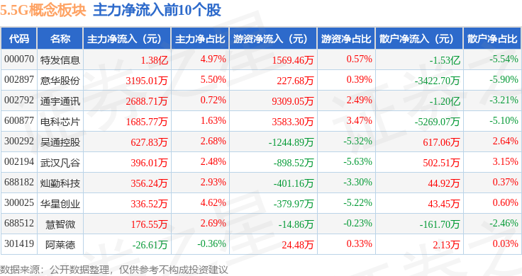 从资金流向上来看,当日5.5G概念板块主力资金净流出6.39亿元,游资资金净流入1.6亿元,散户资金净流入4.79亿元。5.5G概念板块个股资金流向见下表: