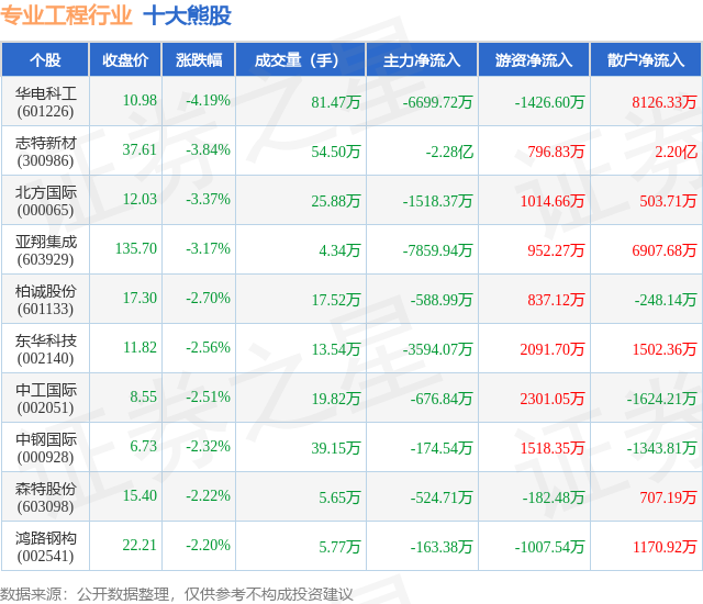 个股表现方面,专业工程行业当日领跌股为华电科工(601226),该股当日报收10.98,下跌4.19%,成交量81.47万,主力资金净流出6699.72万元。志特新材(300986)以下跌3.84%紧随其后,该股当日成交量54.5万,主力资金净流出2.28亿元。除此之外,北方国际(000065)、亚翔集成(603929)、柏诚股份(601133)均进入当日熊股之列。具体个股列表见下表: