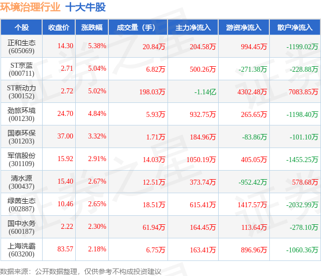 个股表现方面,环境治理行业当日领涨股为正和生态(605069),该股当日报收14.3,上涨5.38%,成交量20.84万,主力资金净流入204.58万元。ST京蓝(000711)以上涨5.04%紧随其后,该股当日成交量6.82万,主力资金净流入500.26万元。除此之外,ST新动力(300152)、劲旅环境(001230)、国泰环保(301203)均进入当日牛股之列。具体个股列表见下表: