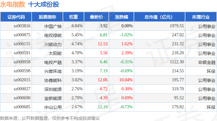 水电指数(399234)十大成份股详情如下: