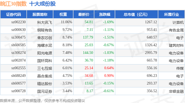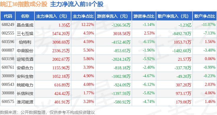 资金流向方面,皖江30(399350)指数成份股当日主力资金净流出合计12.16亿元,游资资金净流入合计5259.94万元,散户资金净流入合计11.63亿元。成份股资金流向详情见下表: