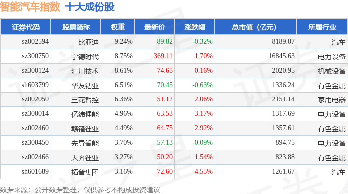 智能汽车(399432)指数十大成份股详情如下:
