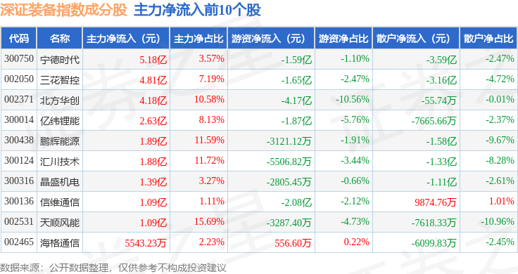 资金流向方面,深证装备(399636)指数成份股当日主力资金净流出合计55.95亿元,游资资金净流入合计11.17亿元,散户资金净流入合计44.78亿元。成份股资金流向详情见下表: