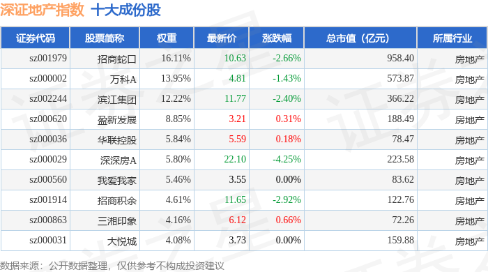 深证地产(399637)指数十大成份股详情如下: