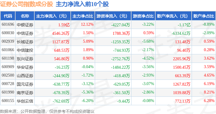 资金流向方面,证券公司(399975)指数成份股当日主力资金净流出合计22.26亿元,游资资金净流入合计4.87亿元,散户资金净流入合计17.39亿元。成份股资金流向详情见下表: