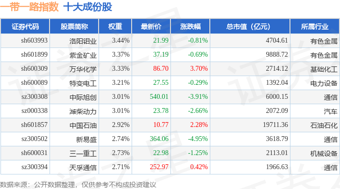 一带一路(399991)指数十大成份股详情如下:
