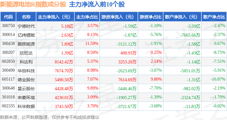 资金流向方面,新能源电池R(480027)指数成份股当日主力资金净流入合计3.82亿元,游资资金净流出合计5.31亿元,散户资金净流入合计1.49亿元。成份股资金流向详情见下表: