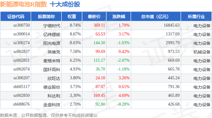 新能源电池R(480027)指数十大成份股详情如下: