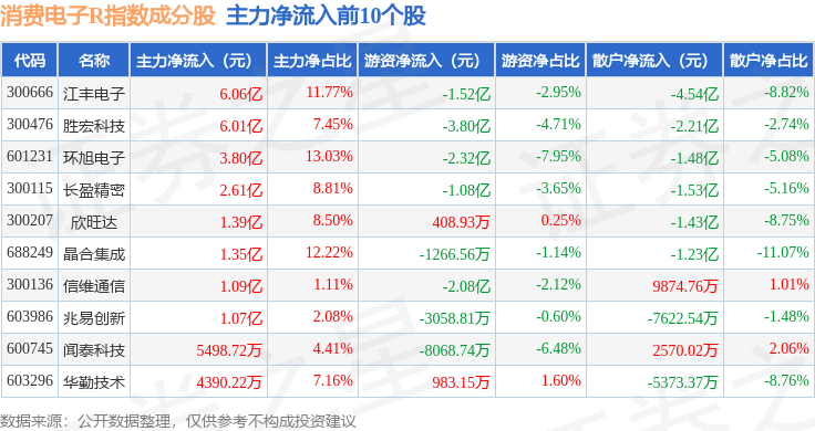 资金流向方面,消费电子R(480030)指数成份股当日主力资金净流入合计10.21亿元,游资资金净流出合计8.5亿元,散户资金净流出合计1.71亿元。成份股资金流向详情见下表: