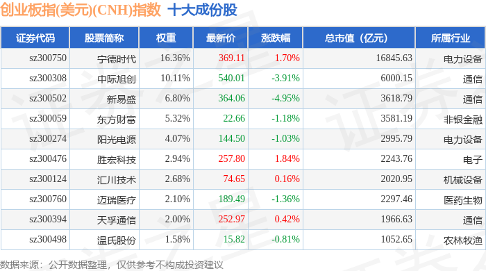 创业板指(美元)(CNH)(970007)指数十大成份股详情如下: