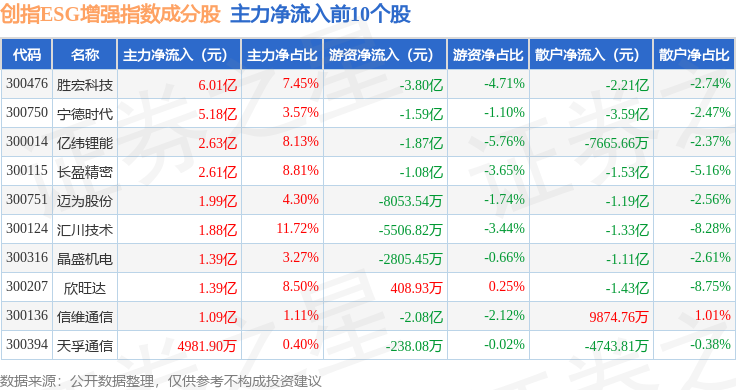 资金流向方面,创指ESG增强(970034)指数成份股当日主力资金净流出合计42.3亿元,游资资金净流入合计21.08亿元,散户资金净流入合计21.22亿元。成份股资金流向详情见下表: