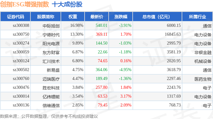 创指ESG增强(970034)指数十大成份股详情如下: