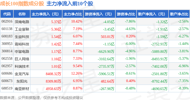 资金流向方面,成长100(980080)指数成份股当日主力资金净流出合计40.07亿元,游资资金净流入合计11.51亿元,散户资金净流入合计28.5亿元。成份股资金流向详情见下表: