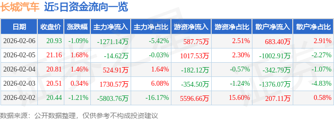 证券之星消息,截至2026年2月6日收盘,长城汽车(601633)报收于20.93元,下跌1.09%,换手率0.18%,成交量11.17万手,成交额2.35亿元。