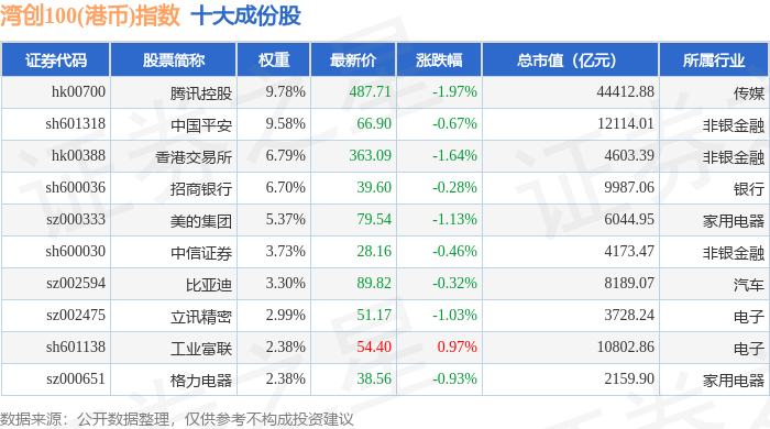 湾创100(港币)(980002)指数十大成份股详情如下: