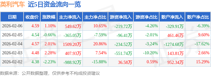 证券之星消息,截至2026年2月6日收盘,英利汽车(601279)报收于4.59元,上涨1.1%,换手率0.71%,成交量11.28万手,成交额5161.14万元。