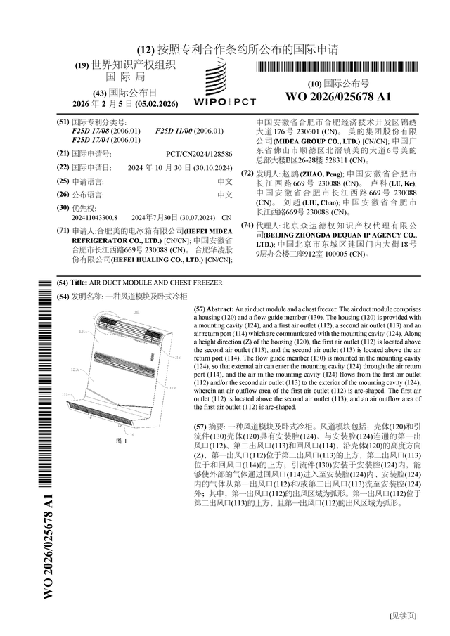证券之星消息,根据企查查数据显示美的集团(000333)公布了一项国际专利申请,专利名为“一种风道模块及卧式冷柜”,专利申请号为PCT/CN2024/128586,国际公布日为2026年2月5日。