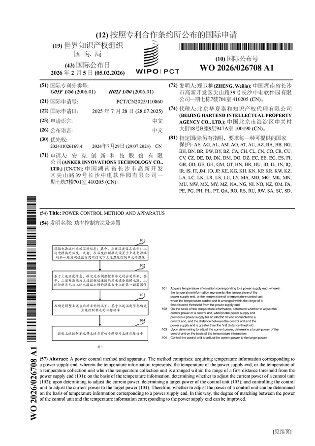 证券之星消息,根据企查查数据显示安克创新(300866)公布了一项国际专利申请,专利名为“功率控制方法及装置”,专利申请号为PCT/CN2025/110860,国际公布日为2026年2月5日。