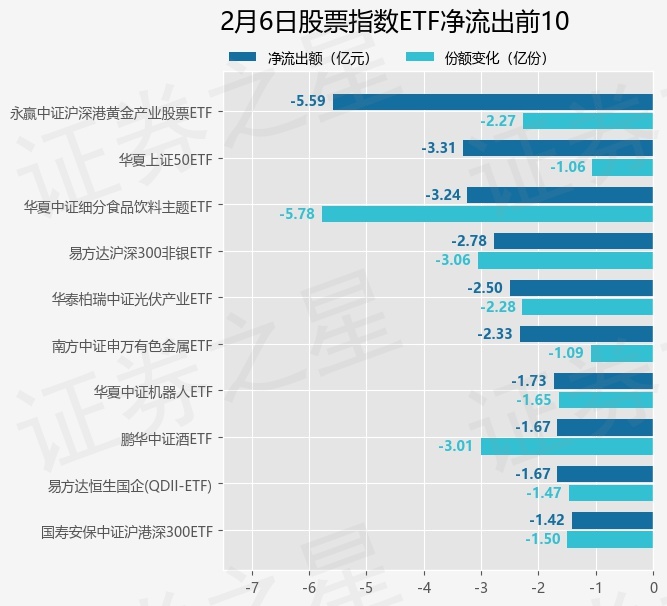 当日有160只股票指数ETF基金出现资金净流出,其中净流出排首位的是永赢中证沪深港黄金产业股票ETF(517520),份额减少了2.27亿份,净流出额为5.59亿元。