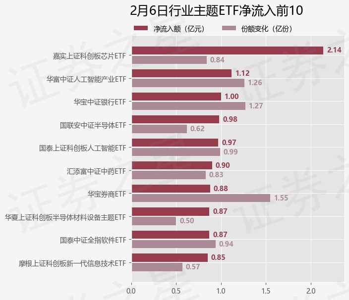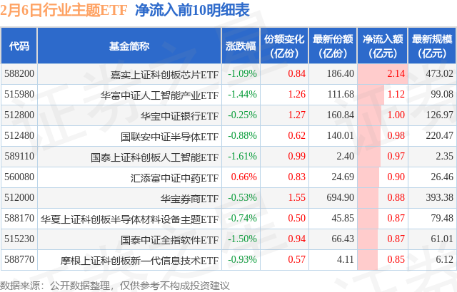 当日有124只行业主题ETF基金出现资金净流入,其中净流入排首位的是嘉实上证科创板芯片ETF(588200),份额增加了8400.0万份,净流入额为2.14亿元。