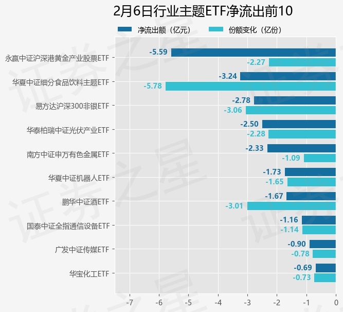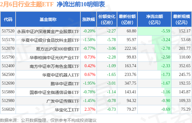 当日有97只行业主题ETF基金出现资金净流出,其中净流出排首位的是永赢中证沪深港黄金产业股票ETF(517520),份额减少了2.27亿份,净流出额为5.59亿元。