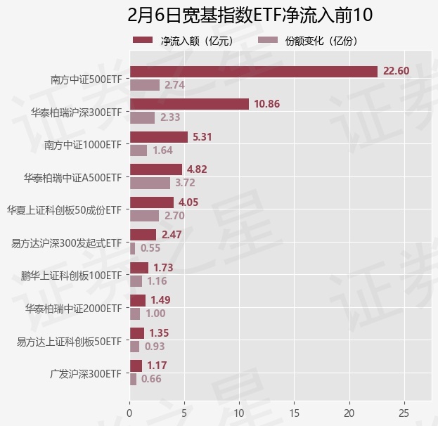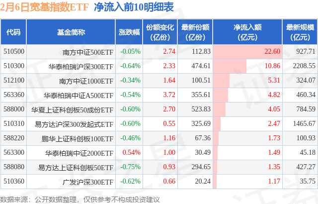 当日有68只宽基指数ETF基金出现资金净流入,其中净流入排首位的是南方中证500ETF(510500),份额增加了2.74亿份,净流入额为22.6亿元。