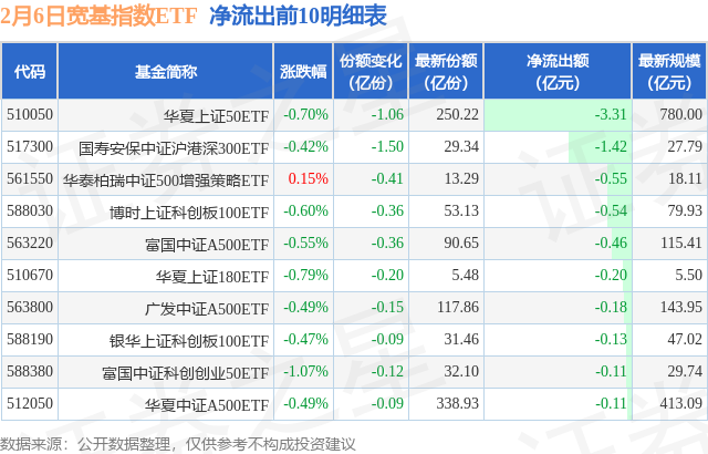 当日有28只宽基指数ETF基金出现资金净流出,其中净流出排首位的是华夏上证50ETF(510050),份额减少了1.06亿份,净流出额为3.31亿元。
