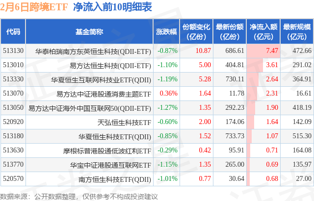 当日有39只跨境ETF基金出现资金净流入,其中净流入排首位的是华泰柏瑞南方东英恒生科技(QDII-ETF)(513130),份额增加了10.87亿份,净流入额为7.47亿元。