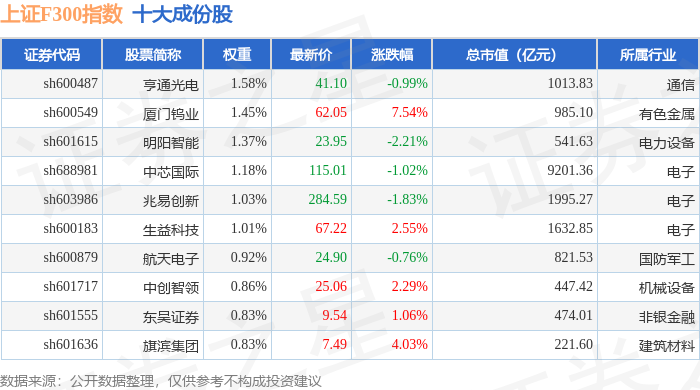 上证F300(000099)指数十大成份股详情如下: