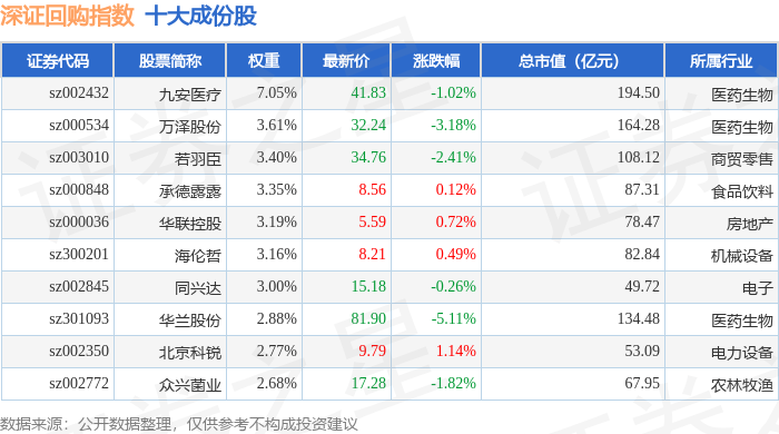 深证回购(970063)指数十大成份股详情如下: