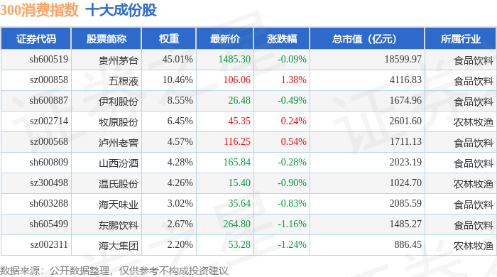 300消费(000912)指数十大成份股详情如下: